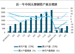 2020年4月中國無縫鋼管產(chǎn)量為261.6萬噸,同比增長9.7%;2020年1-4月中國無縫鋼管產(chǎn)量為808.4萬噸,同比下降5.9%。