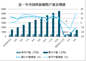 2020年4月中國焊接鋼管產(chǎn)量為568.4萬噸,同比增長19.3%;2020年1-4月中國焊接鋼管產(chǎn)量為1461.5萬噸,同比下降11.2%。