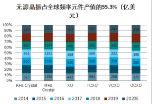 無源晶振占全球頻率元件產值的55.3%(億美元)