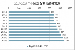 我國作為全球最大的甜食市場之一,同樣伴隨著經濟增長及生活質量提高而不斷擴大。2014年我國甜食零售市場的市場規模800億元,2019年約937億元,復合年增長率約3.2%。預計2020年至2024年間按約3.1%的復合年增長率增長,到2024年將達致約1091億元。