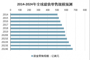 2014年全球甜食市場規模(按零售額計)約506億美元,2019年甜食市場規模約587億美元,復合年增長率約為3.0%。預計2020年全球甜食市場規模(按零售額計)將達到590億美元,2024年約669億美元,復合年增長率約為3.2%。