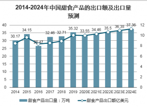 中國甜食出口量與出口額增長趨勢類似,2014年中國甜食出口量30.17萬噸,2019年達到35.32萬噸,預計2024年底出口量將達到約37.36萬噸,2019年至2024年的復合年增長率將約為2.7%。