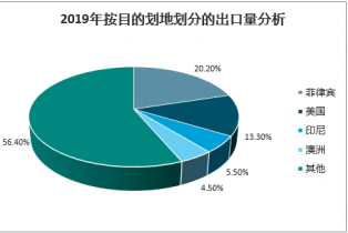 菲律賓為中國甜食的主要出口目的地,于2019年占出口總量的約20.2%,其次為美國(約13.3%)及印尼(約5.5%)。