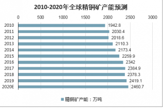 2010-2018年,全球精銅礦產能穩步增長,除2012年以及2018年有小幅下降外,其余年份據保持一定漲幅。2018年全球銅精礦產能為2378.3萬噸。據計算,全球銅精礦產能2015-2018三年復合增長率為1.72%,預計2020年全球銅精礦產能有望突破2460萬噸。