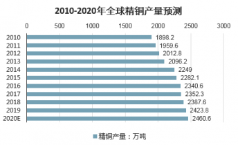 2010-2018年全球精銅產量穩步增長;2018年,全球精銅產量為2423.84萬噸。據計算,2015-2018全球精銅產量三年復合增長率約為1.52%,按此趨勢,2020年全球精銅總供給預計突破2460萬噸。(注:精銅礦產能*精銅礦產能利用率=精銅礦產量,而非精銅產量)