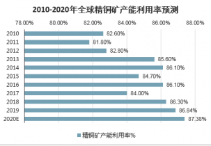 2010-2018年,全球精銅礦產能利用率均在81%-87%之間波動,變化幅度不大。據預測,2019年與2020年全球銅精礦產能利用率分別將約為87.20%、86.76%。