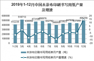 2019年12月中國未涂布印刷書寫用紙產量為496256噸,同比增長14.3%