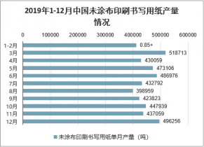 2019年12月中國未涂布印刷書寫用紙產量為496256噸,同比增長14.3%;2019年1-12月中國未涂布印刷書寫用紙產量為5443504噸,同比下降0.2%。