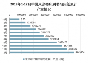 2019年1-12月中國未涂布印刷書寫用紙累計產量情況