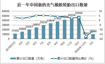 2020年1-3月中國(guó)新的充氣橡膠輪胎出口數(shù)量為10246萬(wàn)條,同比下降11.3%。
