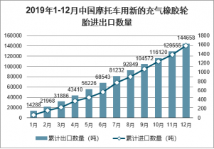 2019年1-12月中國摩托車用新的充氣橡膠輪胎進口數(shù)量為1580噸,同比增長74.3%; 2019年1-12月中國摩托車用新的充氣橡膠輪胎出口數(shù)量為144658噸,同比增長10.6%。