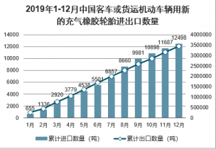 2019年1-12月中國(guó)客車或貨運(yùn)機(jī)動(dòng)車輛用新的充氣橡膠輪胎進(jìn)口數(shù)量為12498噸,同比增長(zhǎng)15.5%; 2019年1-12月中國(guó)客車或貨運(yùn)機(jī)動(dòng)車輛用新的充氣橡膠輪胎出口數(shù)量為3438356噸,同比增長(zhǎng)1%。