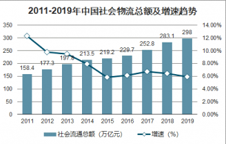 2019年中國社會物流總額為298.0萬億元,按可比價格計算,同比增長5.9%,增速比2018年同期回落0.5個百分點,其中一季度增長6.4%,上半年增長6.1%,前三季度增長5.7%,全年社會物流總額呈緩中趨穩,四季度小幅回升。