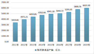 《中國漁業年鑒統計數據》顯示:2011年我國海洋漁業總產值為3419.81億元,2019年我國海洋漁業總產值約為6023.30億元,2011年以來我國海洋漁業總產值復合增長率為6.49%。