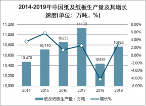 2014-2019年中國紙及紙板生產量及其增長速度(單位:萬噸,%)