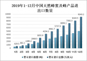 2019年1-12月中國天然蜂蜜及蜂產(chǎn)品進(jìn)口數(shù)量為5055.8噸,同比增長22.3%,出口數(shù)量為124493.9噸,同比下降2.4%;2019年1-12月中國天然蜂蜜及蜂產(chǎn)品進(jìn)口金額為9243.2噸,同比增長12.4%,出口金額為29427.5噸,同比下降8.6%。
