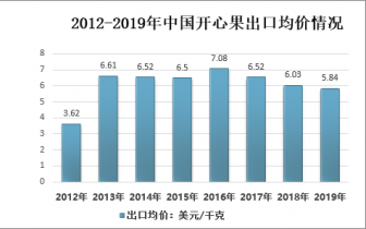 2018年我國開心果出口均價為6.03美元/千克,2019年我國開心果出口均價為5.84美元/千克,出口均價同比下降3.11%。