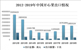 2019年,我國開心果出口數量為0.34萬噸,同比下降1.27%,與2018年基本持平;出口金額為0.20億美元,同比下降4.35%;