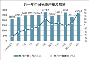 2020年4月中國光纜產量為2673.1萬芯千米,同比增長43.8%。