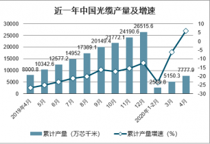 2020年1-4月中國光纜產量為7777.9萬芯千米,同比增長5.9%。