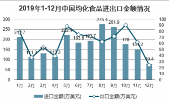 2019年1-12月中國均化食品進口金額為2110.7萬美元;2019年1-12月中國均化食品出口金額為755.5萬美元。
