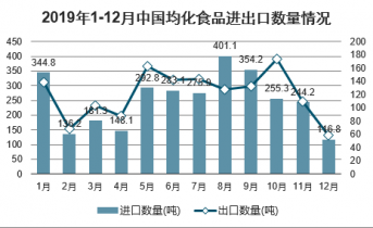 2019年1-12月中國均化食品進口數量為3033.9噸2019年1-12月中國均化食品出口數量為1448.5噸。