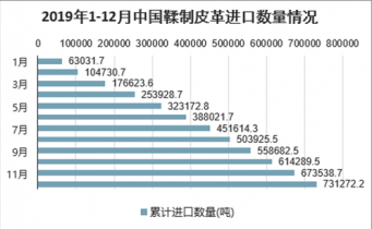 :2019年1-12月中國鞣制皮革進口數量為731272.2噸,同比下降4.0%。