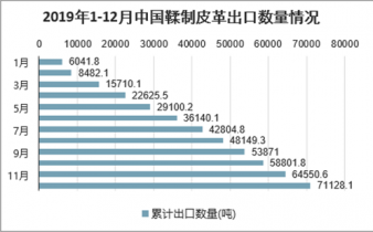 2019年1-12月中國鞣制皮革出口數量為71128.1噸,同比增長24.2%。