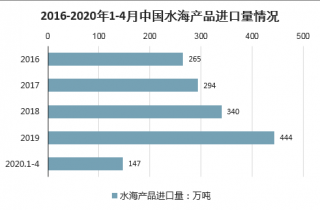 受疫情影響,2020年1-4月中國水海產品進口量僅小幅度增長,2020年1-4月中國水海產品進口量為147萬噸,同比增長4.5%。進口金額為45.18億美元,同比下降8.4%。