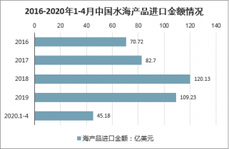 受疫情影響,2020年1-4月中國水海產品進口量僅小幅度增長,2020年1-4月中國水海產品進口量為147萬噸,同比增長4.5%。進口金額為45.18億美元,同比下降8.4%。