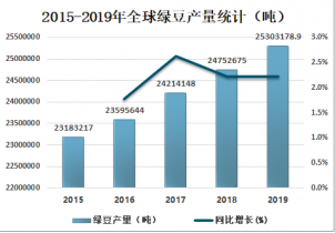 2018年全球綠豆產量為24752675噸,同比增長2.2%。預計2019年全球綠豆產量為25303178.9噸。