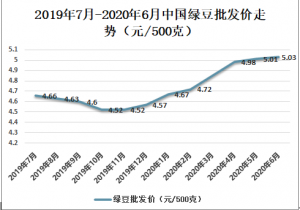 2019年7月-2020年6月中國綠豆批發價從4.66元/500克增長至5.03元/500克,增長了0.37元/500克。