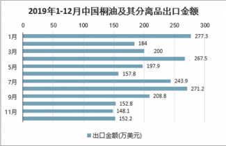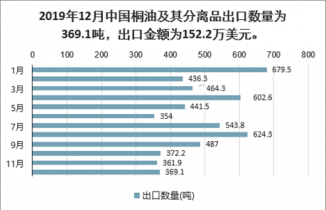 2019年12月中國桐油及其分離品出口數量為369.1噸,出口金額為152.2萬美元。
