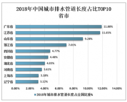 全國來看,我國城市排水管道長度總量逐年增長,尤其是近10年我國加快排水管網的建設發展。國家統計局數據顯示,2015年我國城市排水管道長度為54.0萬公里,同比增長5.6%。到了2018年我國城市排水管道長度達到68.3萬公里,同比增長8.41%;其中廣東省城市排水管道長度占比11.885,為全國第一,其次是江蘇省,占比為11.65%,第三是山東省,占比9.28%。2019年我國城市排水管道長度大約為73.4萬公里。
