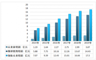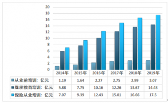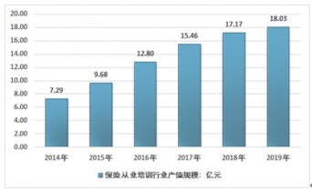 據統計2019年我國保險從業培訓市場規模為17.5億元,其中從業前培訓規模為3.07億元,繼續教育培訓市場規模為14.43億元。