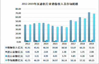 壓濾機產品被廣泛應用于環保、礦物及加工、化工、食品、醫藥等領域。隨著國家對環境保護重視程度的不斷增強,2015年以來,新興行業,尤其是環保、污水污泥處理行業對壓濾機的需求呈上升趨勢,2019年我國壓濾機制造行業銷售收入為72.55億元,出口金額為5.40億元,進口金額為2.08億元,2019年我國壓濾機市場規模為69.23億元。