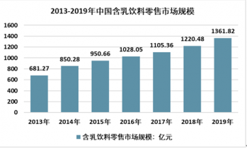 近幾年,我國含乳飲料行業(yè)零售市場規(guī)模快速增長,從2013年的681.27億元增長到了2019年的1361.82億元。