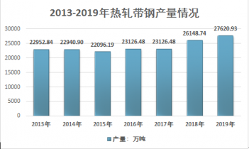 熱軋帶鋼是指通過熱軋方式生產的帶材和板材。一般厚度在1.2~8mm。寬度在600mm以下的帶鋼稱為窄帶鋼,超過600mm的為寬帶鋼。2019年我國熱軋帶鋼產量為27620.93萬噸,較2018年同比增長5.63%。