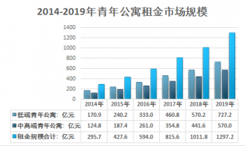 2019年我國青年公寓租金規(guī)模為1297.2億元,其中低端青年公寓租金規(guī)模為727.2億元,中高端公寓租金規(guī)模為570.0億元。