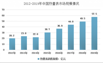 隨著國內供熱面積的增長,國內對熱量表市場需求不斷增長,國內熱量表市場規模也呈現快速增長態勢,從2012年的20.15億元增長到了2019年的57.5億元,近幾年我國熱量表市場規模情況如下圖所示: