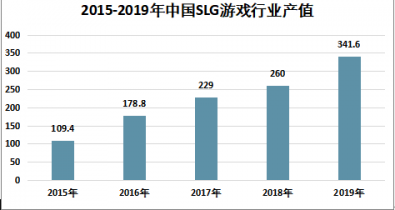 近幾年,我國SLG游戲廠家不僅開發(fā)國內(nèi)市場,還大量進(jìn)軍國際市場,SLG游戲行業(yè)產(chǎn)值規(guī)模快速增長,從2015年的109.4億元,增長到了2019年的341.6億元。如下圖所示: