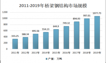 2011年我國橋梁鋼結構行業產量333.25萬噸,到2019年增長到了1077.75萬噸,近幾年我國橋梁鋼結構行業產量情況如下圖所示:
