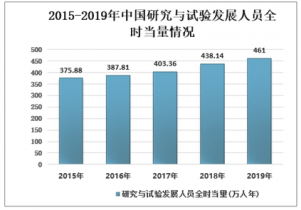 國家統計局數據顯示,2018年我國研究與試驗發展人員全時當量438.14萬人年,2019年我國研究與試驗發展人員全時當量461萬人年,比上年末增加22.86萬人年,同比增長5.22%。
