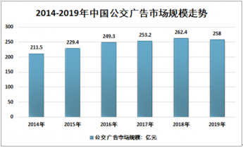 公交廣告作為戶外廣告的分支,隨著中國戶外廣告規(guī)模的擴(kuò)張,公交廣告的發(fā)展也得到一定補(bǔ)充。近幾年我國公交廣告產(chǎn)業(yè)市場規(guī)模總體呈現(xiàn)增長態(tài)勢,從2014年的211.5億元增長到了2019年的258億元。