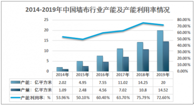 2019年我國墻布行業(yè)產(chǎn)能20億平方米,產(chǎn)量14.52億平方米,產(chǎn)能利用率72.6%,近幾年我國墻布行業(yè)產(chǎn)能及產(chǎn)能利用率情況如下圖所示: