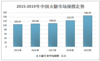目前我國火腿行業尚且處于工業化初期,產業規模小,未來隨著現代加工技術和生產設備的升級,火腿在風味、工藝、口感和品類等方面還有較大的開發空間,火腿產業產值將持續增長,火腿的潛在消費市場空間巨大。2015-2019年中國火腿行業市場規模從105.47億元增長至146.59億元,復合增長率8.58%。