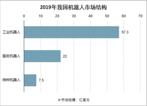 從我國(guó)機(jī)器人市場(chǎng)結(jié)構(gòu)來(lái)看,2019年工業(yè)機(jī)器人市場(chǎng)占比最大,其市場(chǎng)規(guī)模約為57.3億美元,服務(wù)機(jī)器人市場(chǎng)規(guī)模約為22億美元,特種機(jī)器人市場(chǎng)規(guī)模約為7.5億美元。