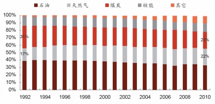 1992-2010 年間德國天然氣占比緩慢上升5 個百分點,煤炭占比緩慢下降8 個百分點