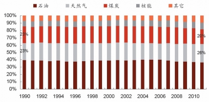 1990-2011 年間美國天然氣占比緩慢上升3 個百分點,煤炭占比緩慢下降3 個百分點