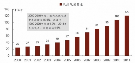 本文導讀:《2012-2016年中國天然氣市場供需預測與投資前景評估報告》內容顯示:2000-2010 年間中國天然氣消費年均增速15.9%,顯著高于1990-2000 期間的4.9%。2011 年中國天然氣消費量達到1205 億立方米,占一次能源消費總量的4.6%,國家規劃“十二五”末天然氣消費達到2300 億立方米,占一次能源消費總量的比重上升至7.5%,意味著2012-2015年年均增速將達到17.5%。